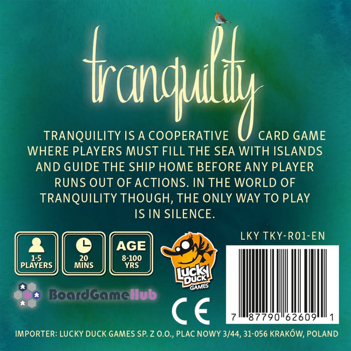 Hop aboard the ship Tranquility for a co-operative card game where players aim to fill the sea with numbered island cards and guide the ship home. Players must maintain silence as they strive to complete the grid before any other player exhausts their actions. Victory is achieved by placing cards in ascending numerical order from bottom left to top right, with a Start and Finish card placed to win collectively. Should any player be unable to legally play or discard cards, all players lose.